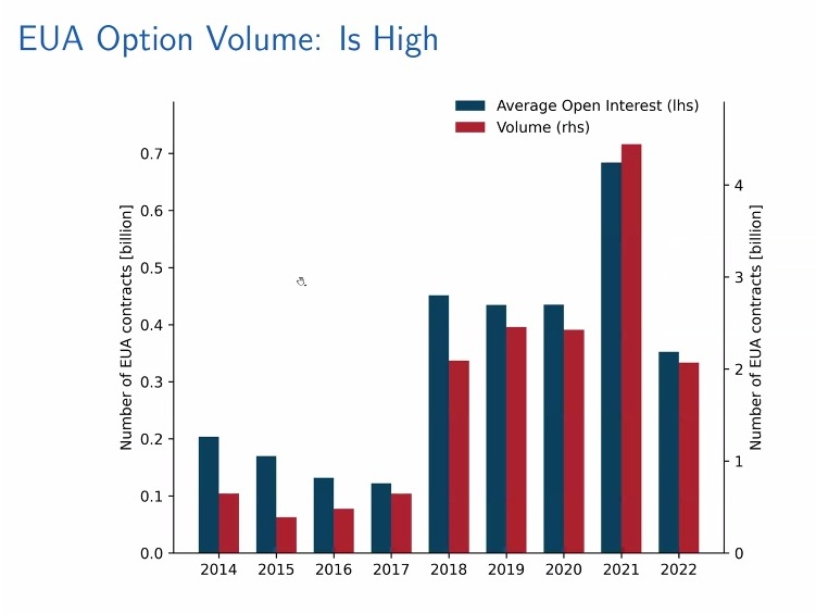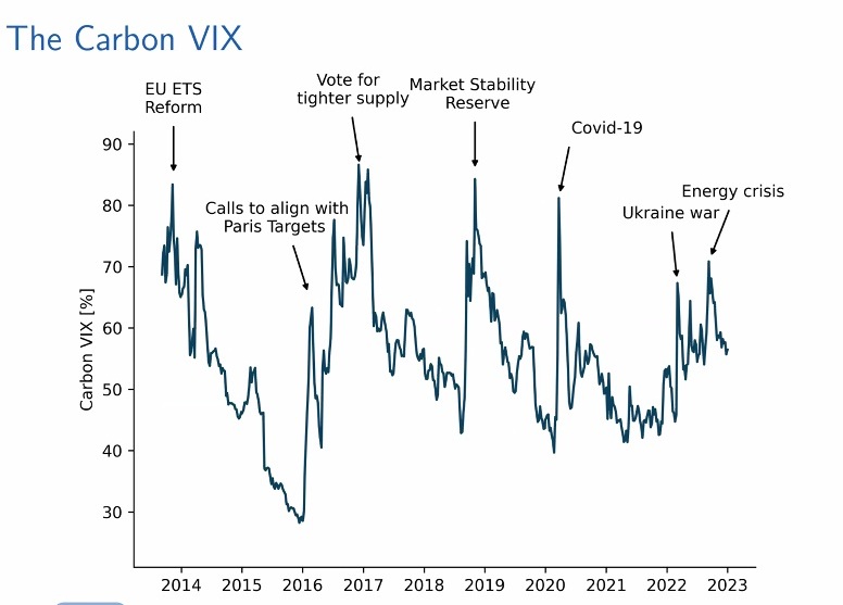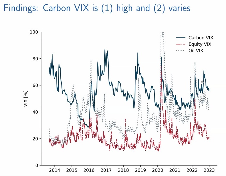 How to express volatility? The original VIX is the 30-day expected volatility of the SP500 index. Following the same methodology, Stroebel and co-workers constructed the “Carbon VIX,” “based on building a portfolio of options whose final payoff approximates the realized variance of EUA futures until option expiry.” He described it as a “model-free” treatment that requires liquidity across the moneyness.