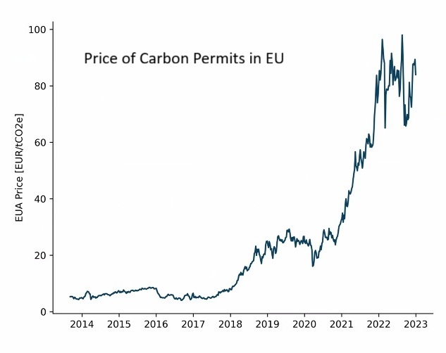 The researchers chose to study the EU Emissions Trading System (EU ETS), which is the world’s oldest cap-and-trade system, in place since 2005. A European Union Allowance (EUA) represents the permit to emit one tonne of carbon dioxide equivalent (CO2e). The markets for EUAs are well developed, consisting of primary (auctions), secondary, futures, and futures options. The graph below shows the price of permits over twenty years.